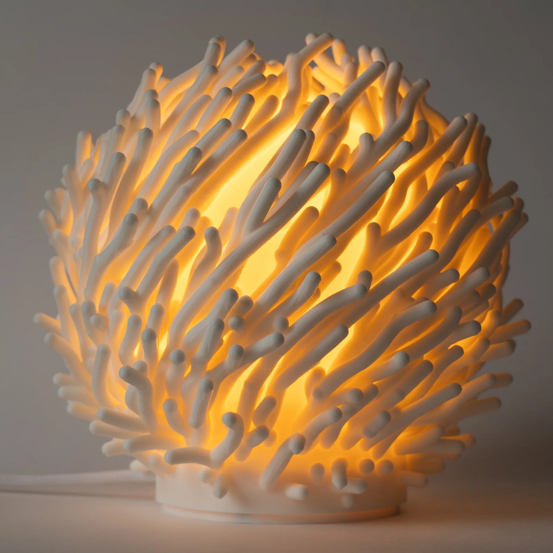 Inspired by the delicate complexity of coral formations, the lamp blends organic branching forms with fluid volumetric curves. This textured silhouette glows with a soft, ambient light that turns any space into a refined focal point, captivating whether lit or unlit.